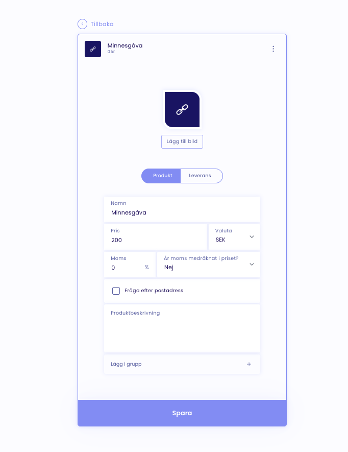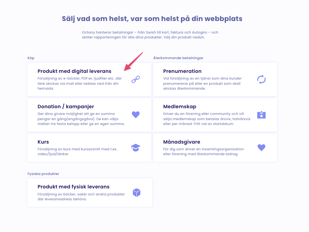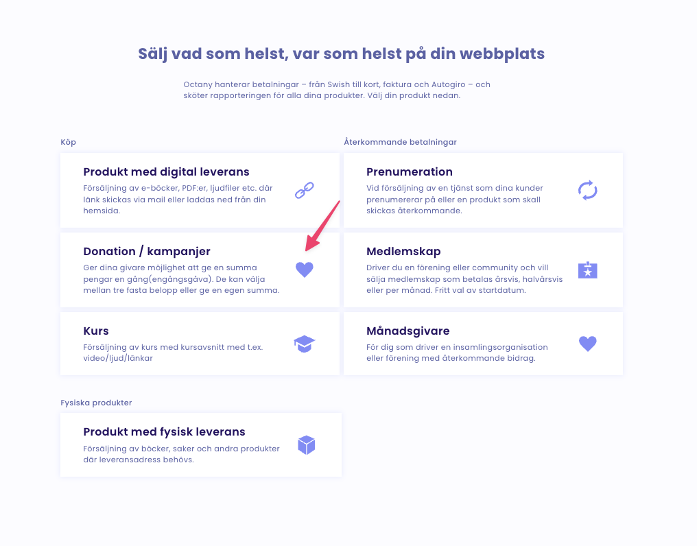 Det finns två olika sätt att skapa gåvobrev och det beror på om ni vill erbjuda gåvobrevet för en satt summa (säg 200kr per gåvobrev) eller använda Octanys gåvowidget, där tre förvalssummor visas för givaren, dessutom kan givaren välja ett eget belopp.