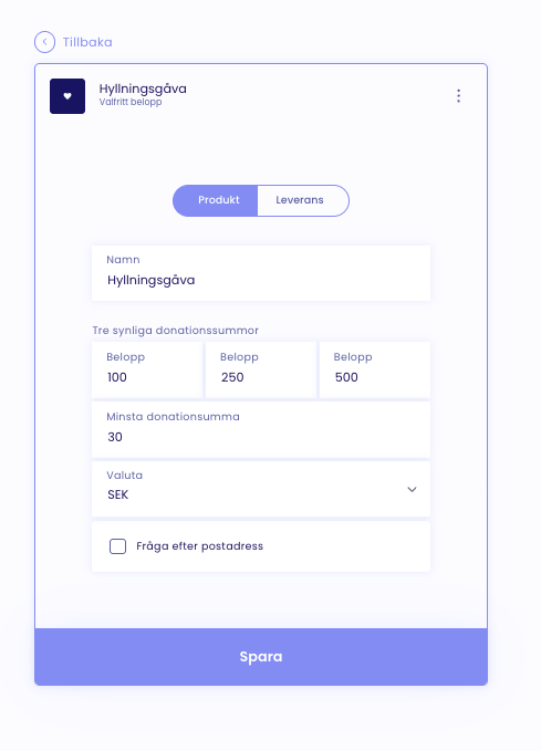 Om du vill kan du redigera de synliga förvalsbeloppen eller ändra minsta donationssumma.