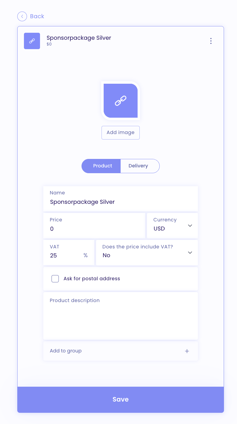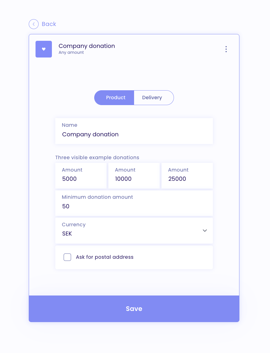 Write the name of the product and then edit your selection amounts and minimum donation amount.