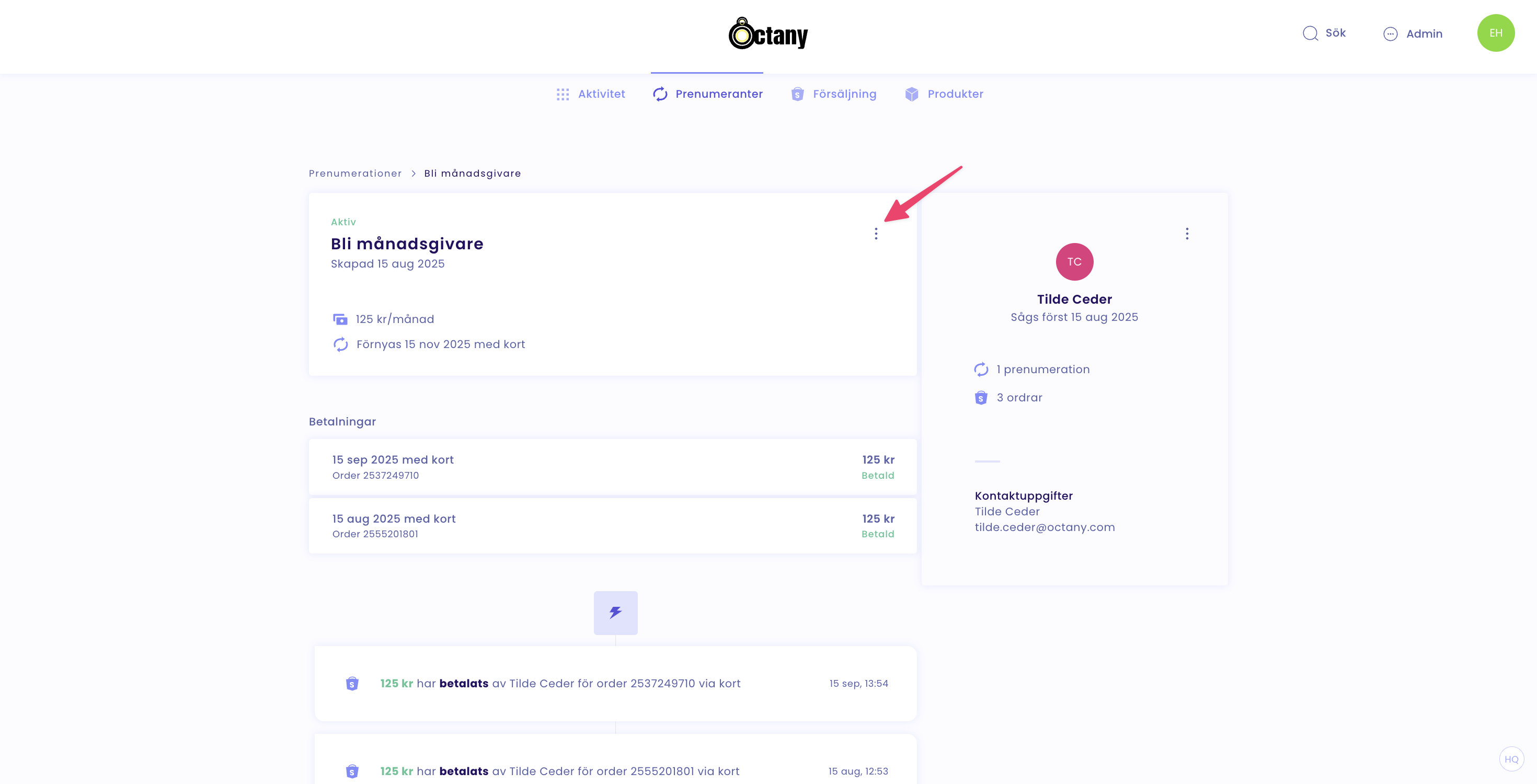 Gå in på givarens prenumeration och tryck på de tre prickarna: