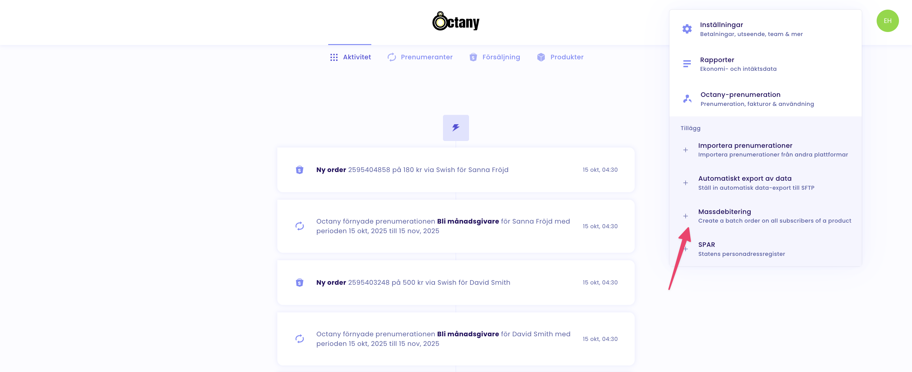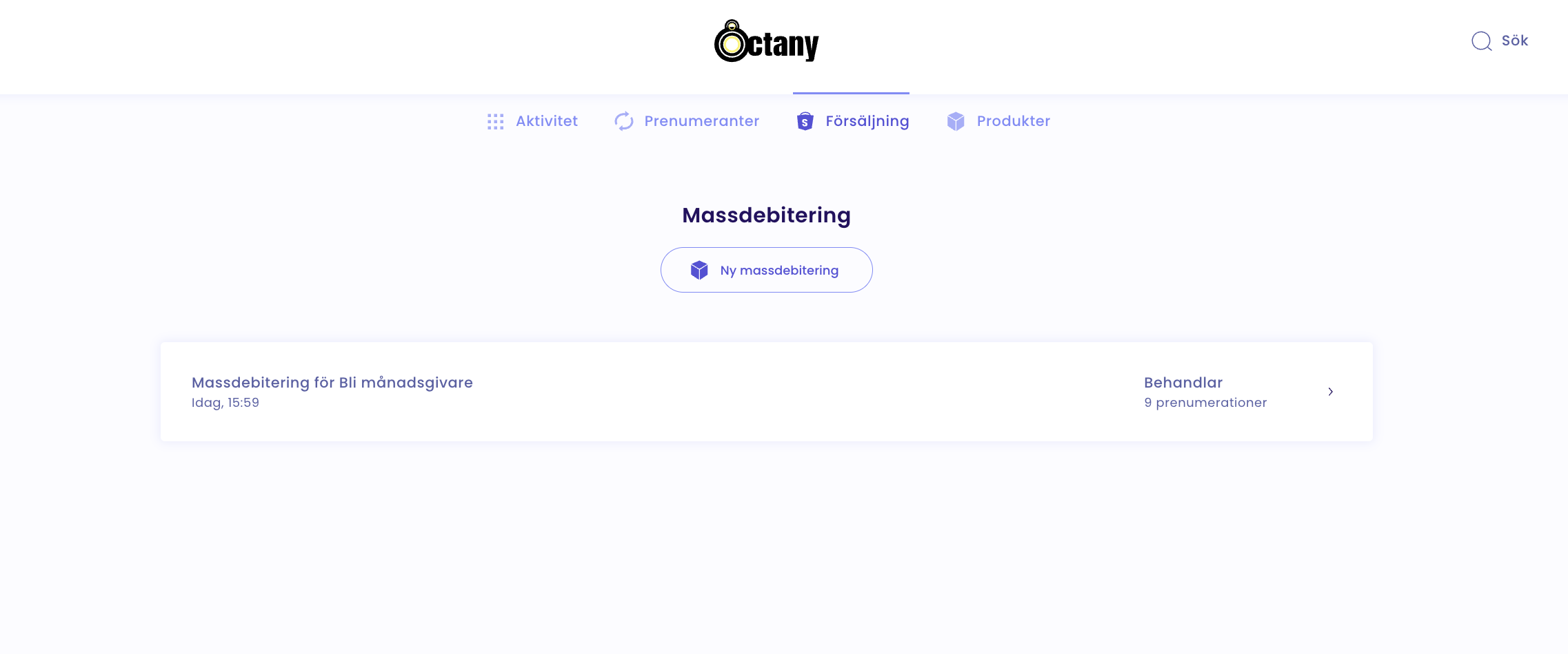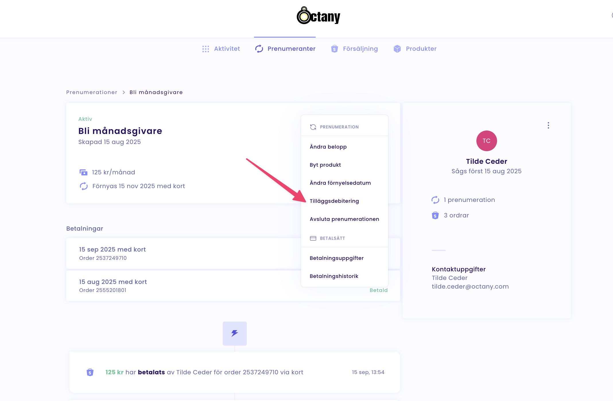 Därefter börjar Octanys betalmotor göra dessa debiteringar, vilket du ser då status på tilläggsdebiteringarna är "Behandlar":