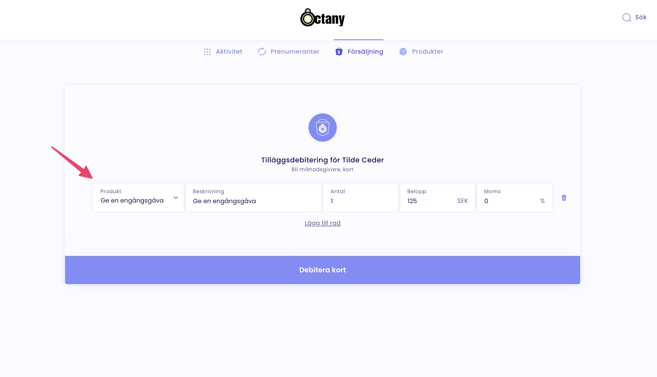 För att göra en tilläggsdebitering är det viktigt att du har en produkt för engångsbetalningar, såsom detta där vi har en för Ge en engångsgåva här i exemplet. Detta är viktigt då du behöver ha en produkt för en engångsbetalningar för att kunna göra en engångsdebitering.