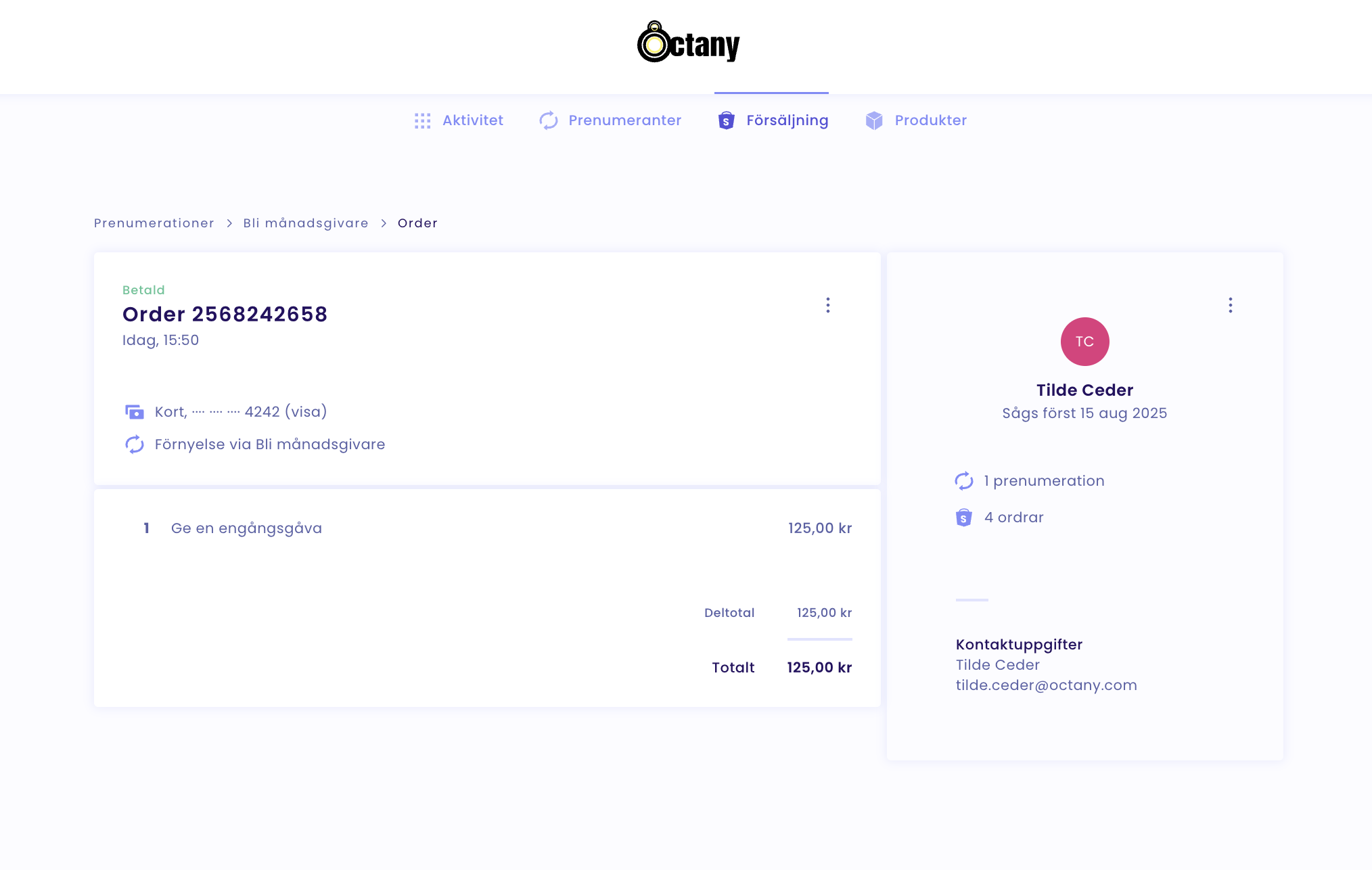 Sedan dyker ordern upp för givaren, och du ser att givarens kontaktkort har uppdaterats med ännu en order: