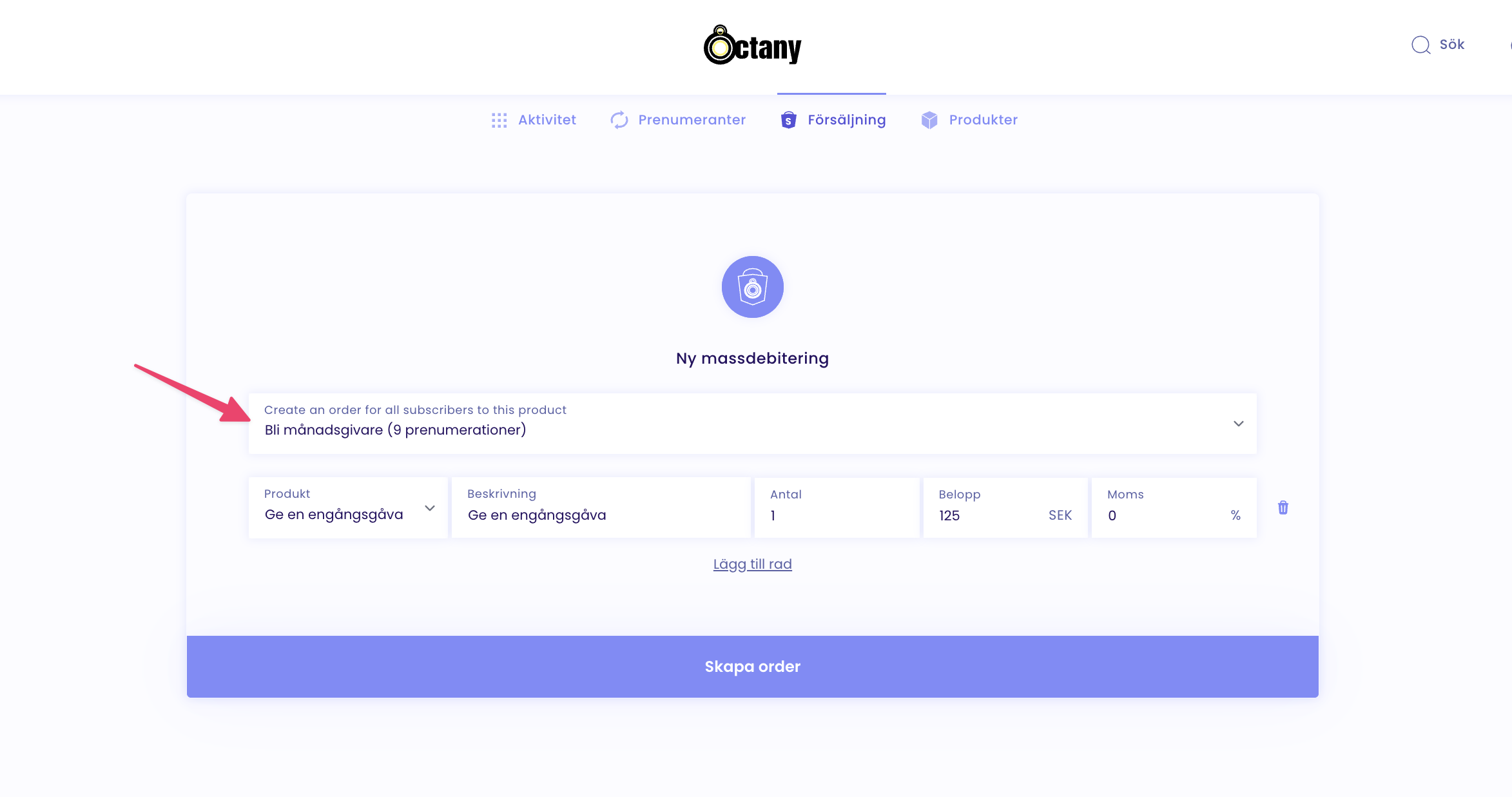 Välj för vilken Produkt du vill att samtliga prenumeranter ska få en tilläggsdebitering: