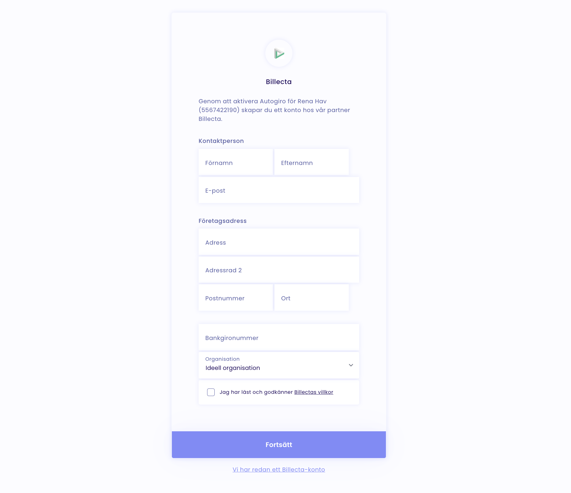 Fyll i era uppgifter och slutligen ert bankgironummer. Godkänn villkoren och tryck på Fortsätt.