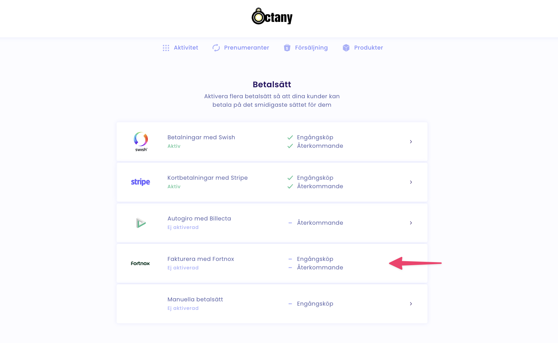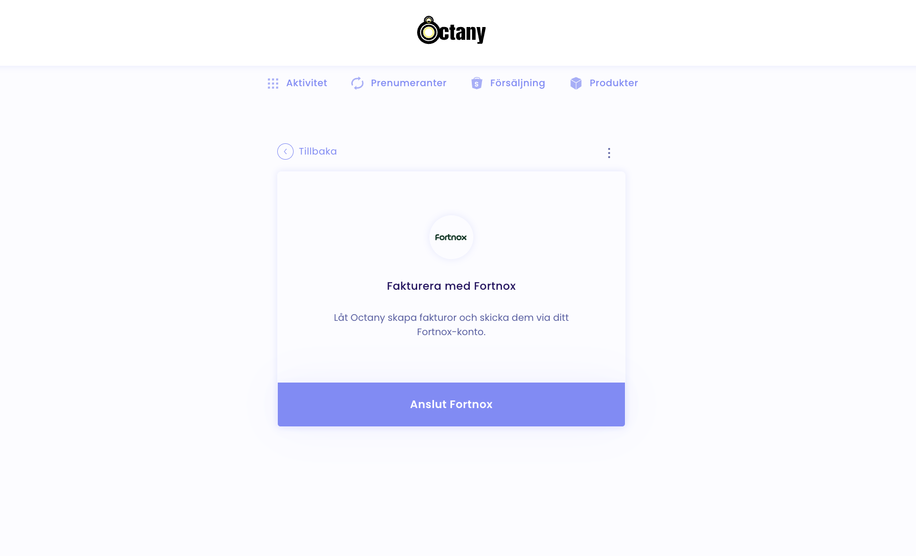 För att använda fakturor via Octany behövs det att ni har Fortnox Fakturering. Kolla om du i ditt paket från Fortnox har Fortnox Fakturering. Annars behöver du beställa det här.