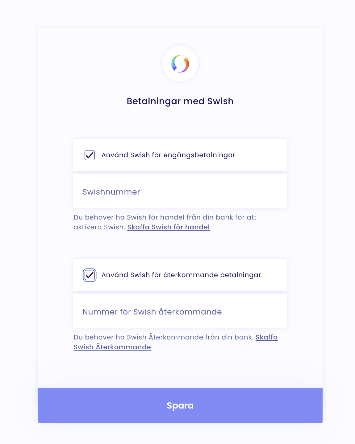 Välj om du vill använda Swish för engångsbetalningar eller återkommande betalningar