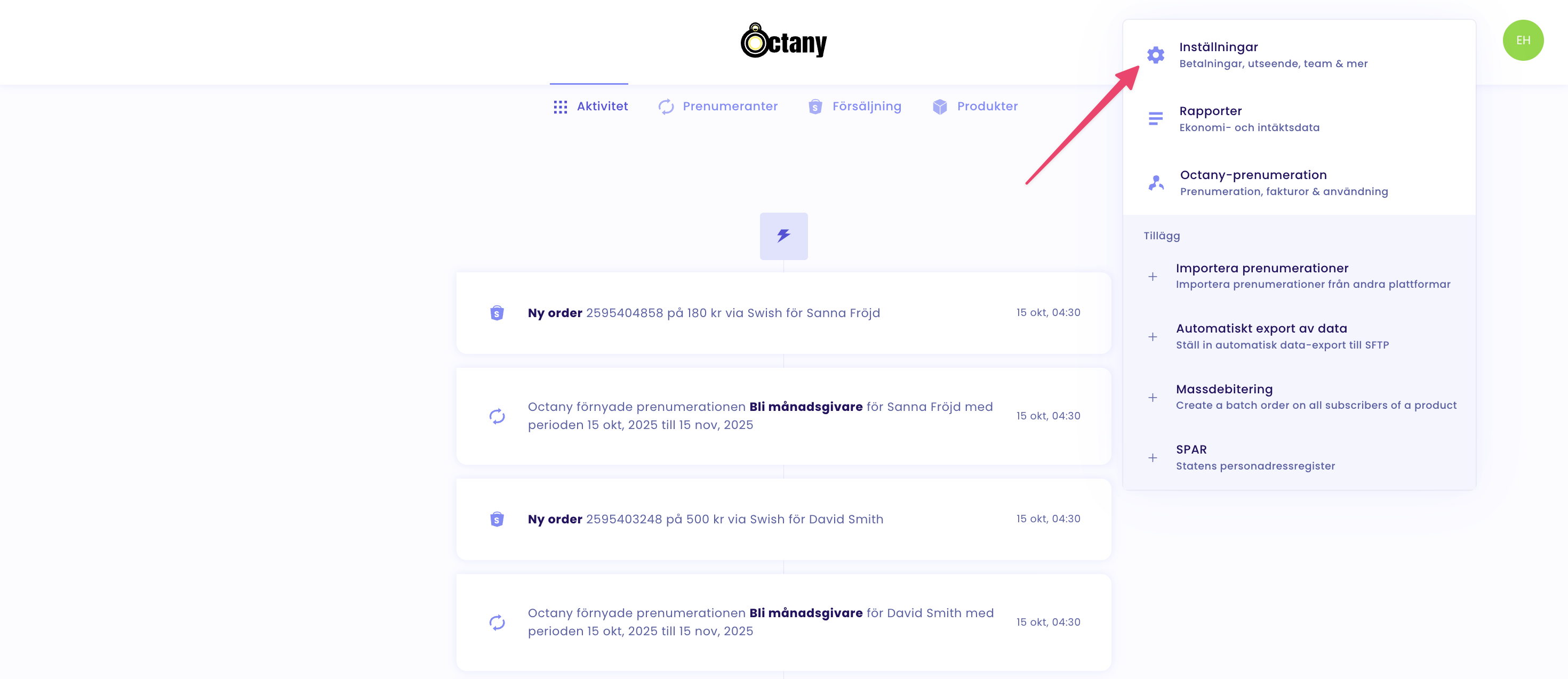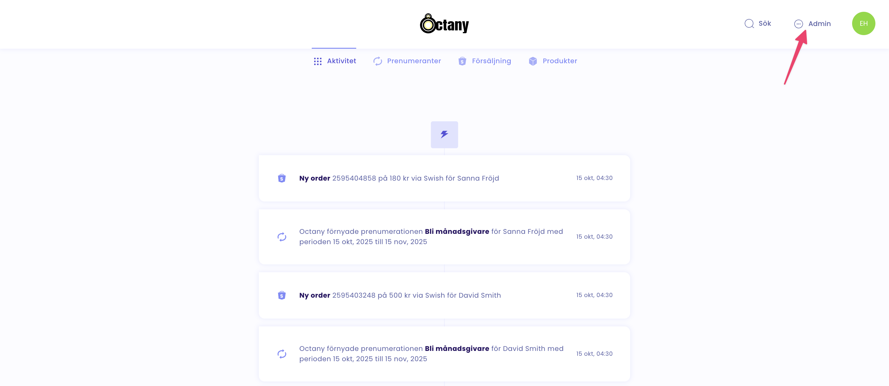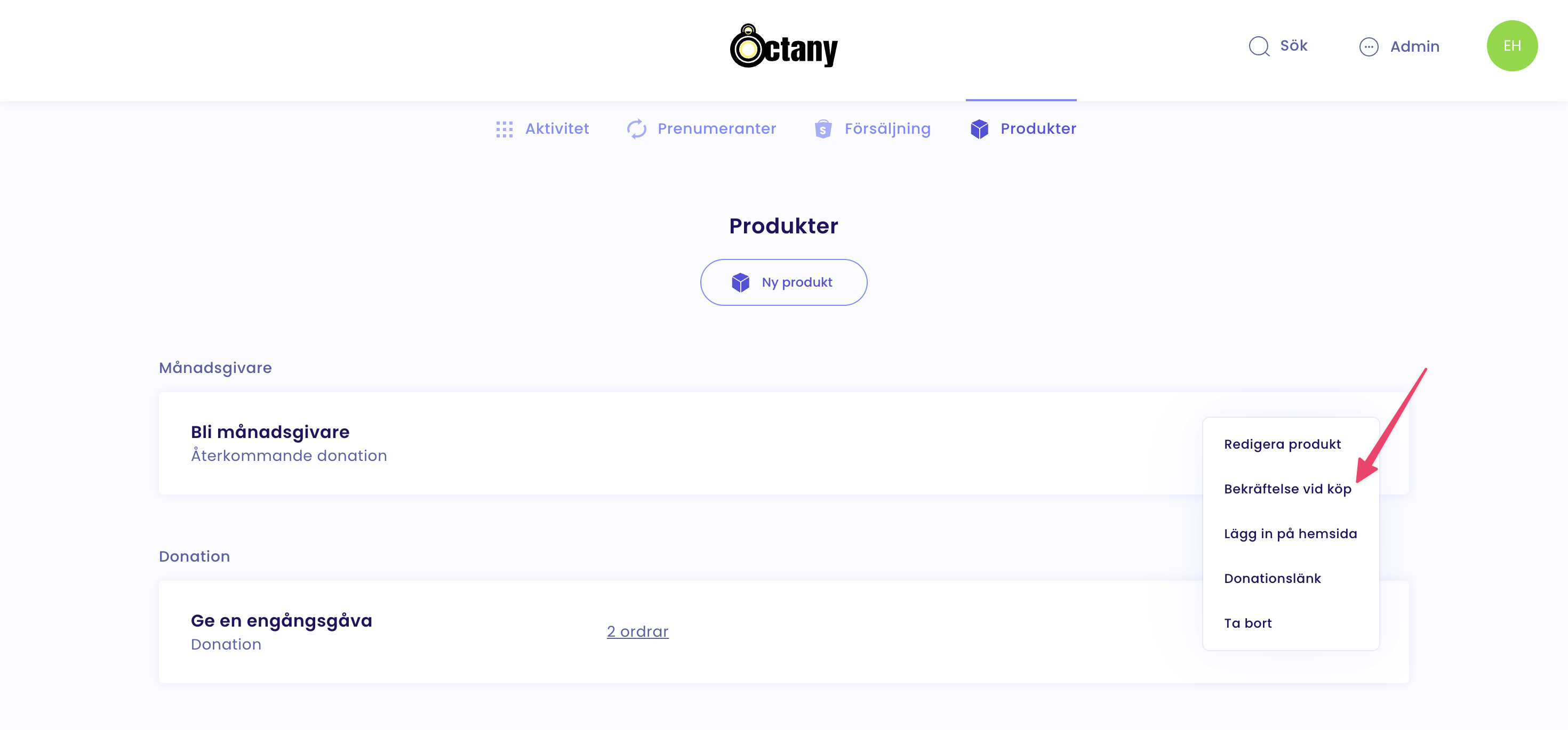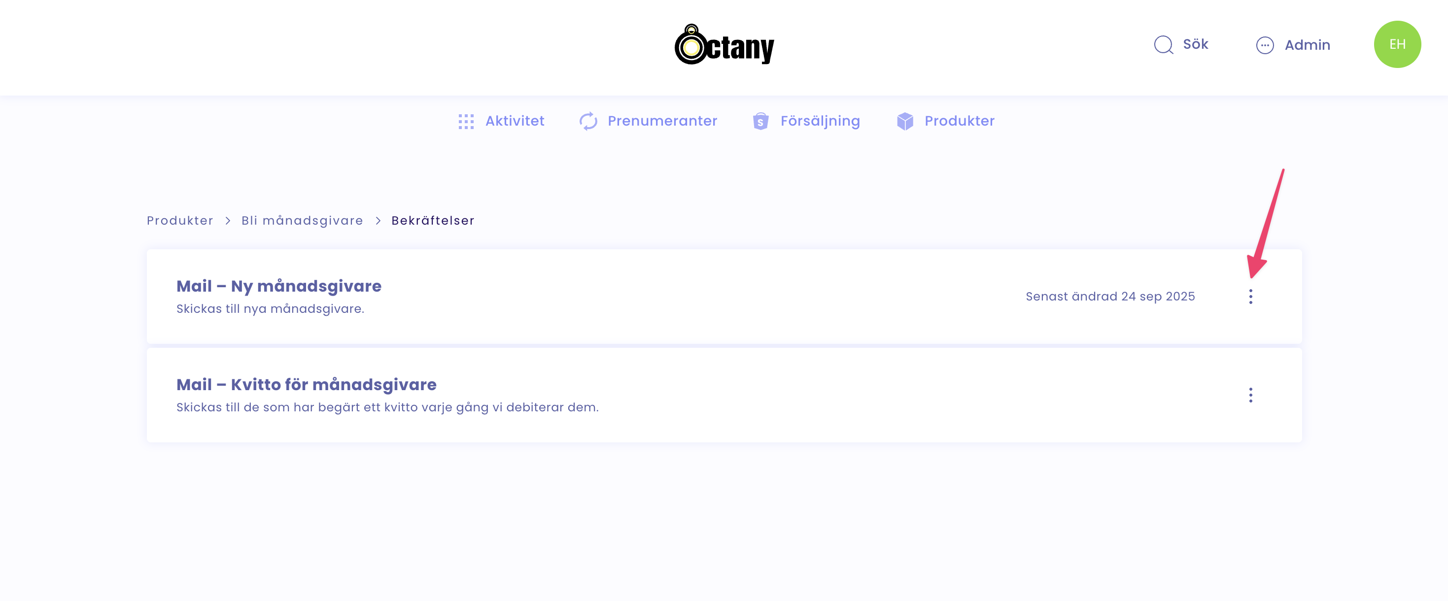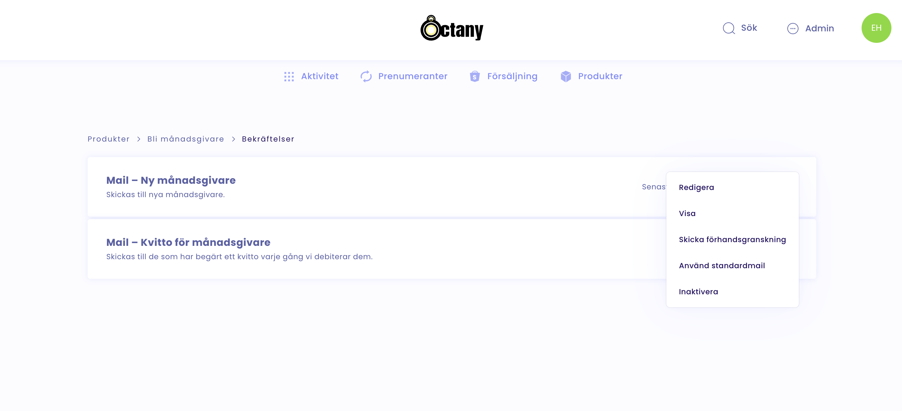 Octany skickar alltid ut ett bekräftelsemail efter varje nytt engångsköp eller vid början av en ny prenumeration (t.ex. vid en ny månadsgåva, ett medlemskap eller liknande som debiteras återkommande)