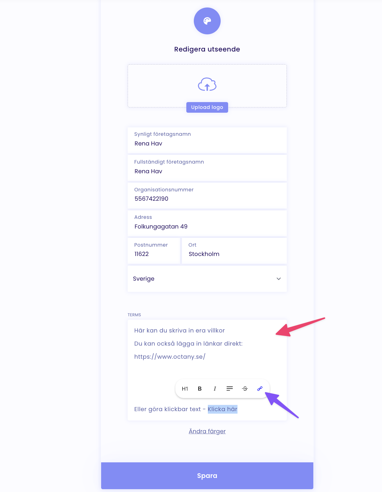 Om du vill lägga in en länk kan du kopiera in den direkt, eller markera den text du vill ska vara klickbar och lägga in länken (se lila pilen).