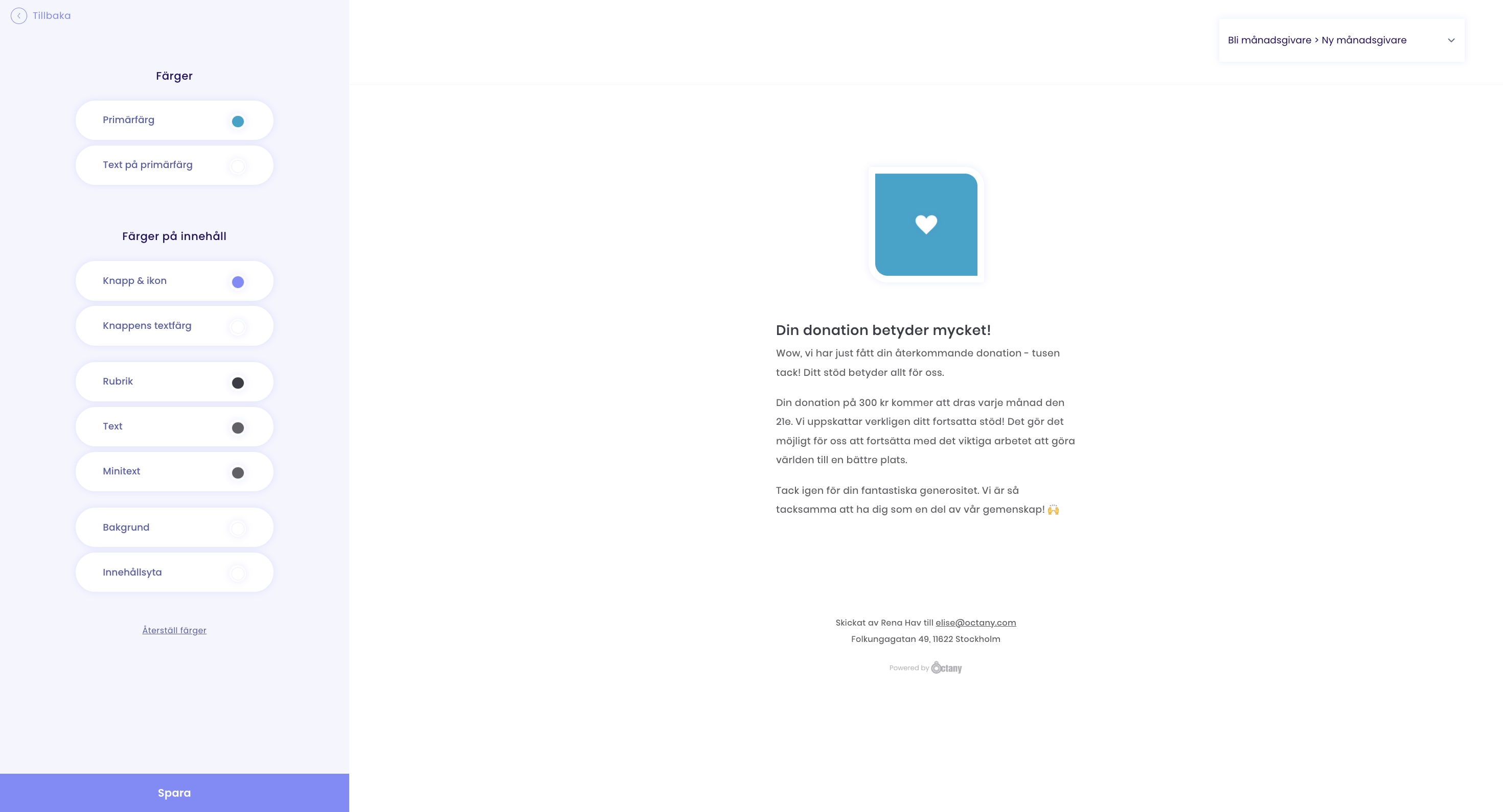 Primärfärg och text på primärfärg omfattar Octanys widgets och knappar, det vill säga de element som ni lägger in på er sida för att ta emot gåvor, betalningar eller medlemskap.