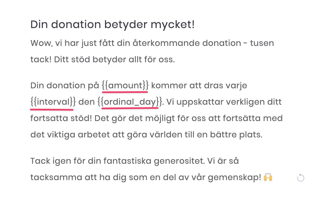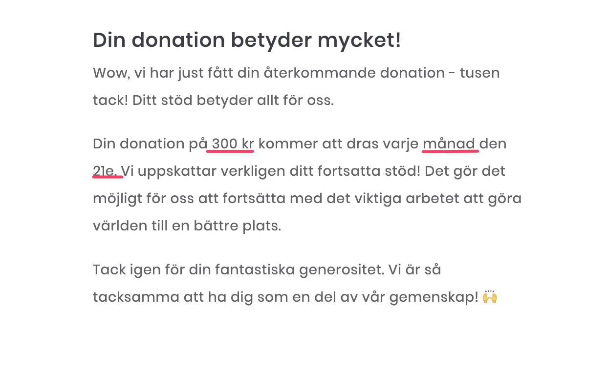 Dessa parametrar i mailet hämtar automatiskt in givarens belopp, debiteringsintervall och förnyelsedatum: