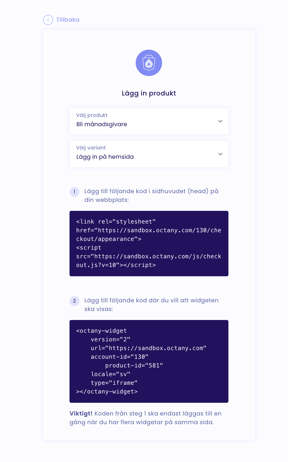 Om du lägger in flera av Octanys gåvomoduler på samma sida så räcker det med att sidan har ett exemplar av <link> och <script> på sidan. För att lägga in flera produkter, lägg då bara till flera kodsnuttar för <octany-widget>. En per produkt.